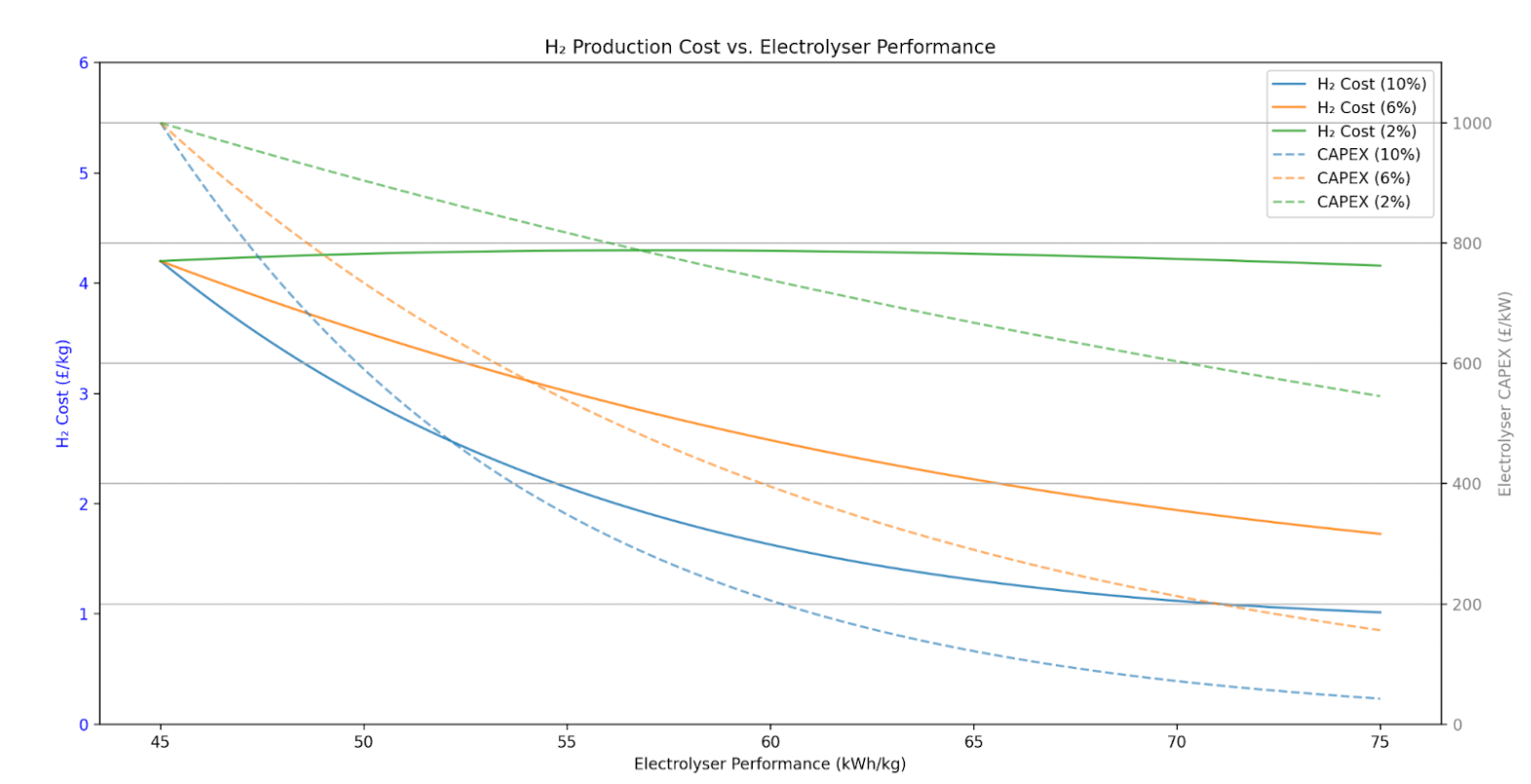 The above graph shows £/kg H2 on the left-hand side Y axis, and % capex reduction on the right-hand side Y axis plotted against electrolyser performance on the X axis. The graph describes the relationship between capex and efficiency for the PEM electrolyser numbers from earlier, £1000/kW capex and 45 kWh/kg efficiency, and how a fixed capex reduction by either 2%, 6%, or 10% for every 1kWh of performance loss influences £/kg H2.